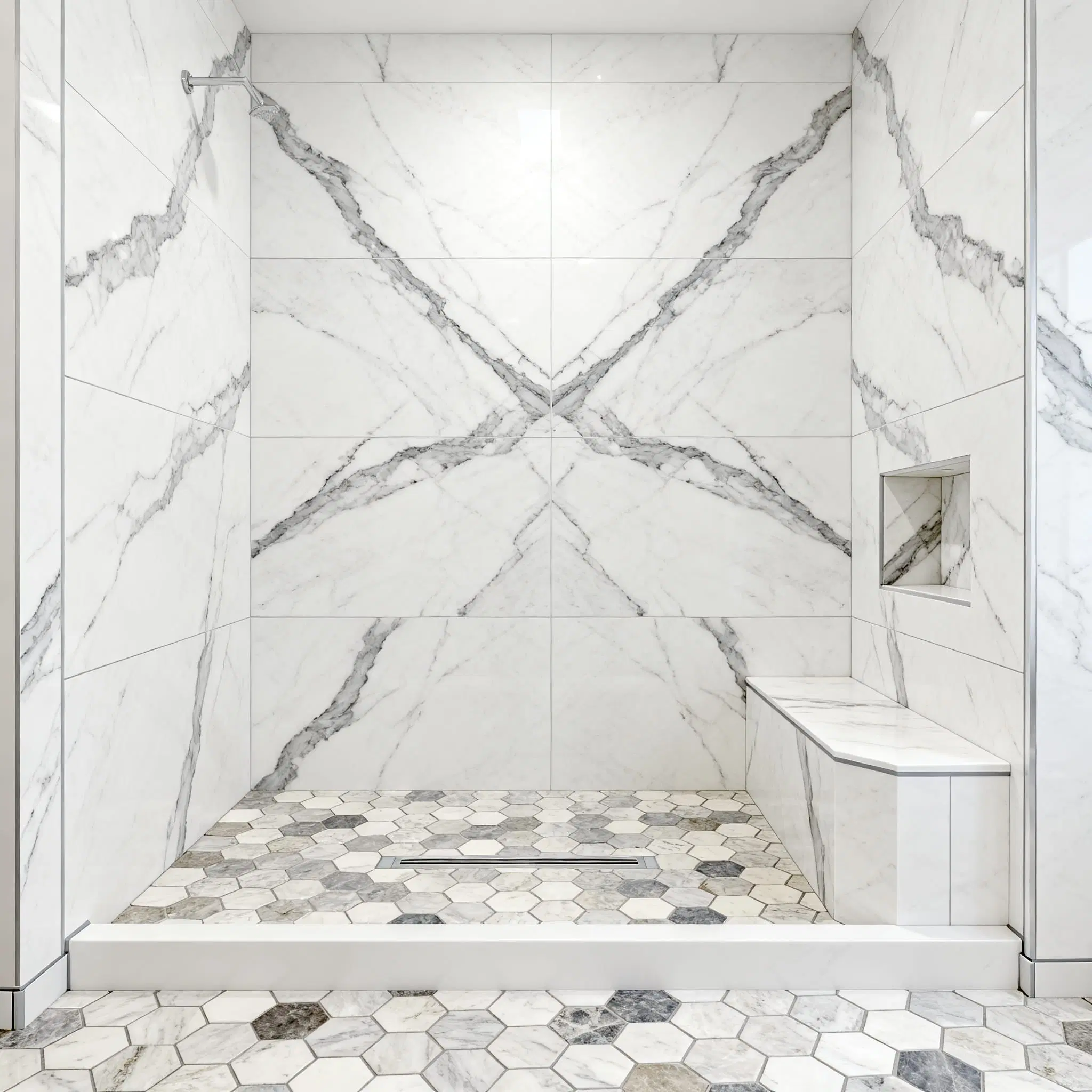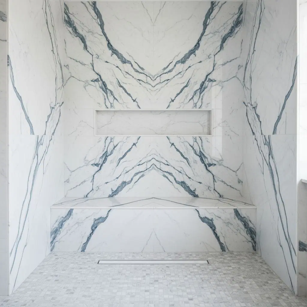 Porcelain slab showers & feature walls with vein continuity.