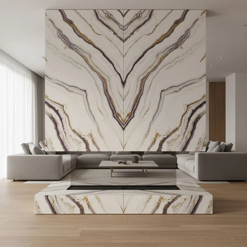 Porcelain slab installation for showers, fireplaces, and feature walls requiring advance planning and precise handling. Panel layout is coordinated early to manage cuts, seams, and visual continuity.