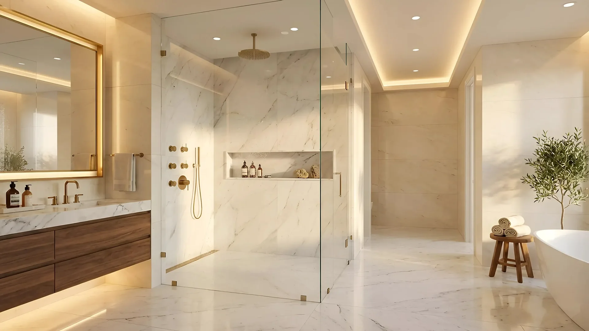 Porcelain slab showers & feature walls with vein continuity.
